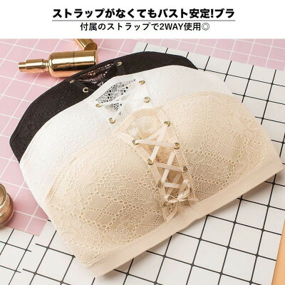 送料無料 ブラジャー ストラップレスブラ ノンワイヤーブラ 2WAY レディース 1/2カップブラジャー オフショルダーブラ 3ホック 4段階調整 レース レースアップ インナー 女性下着 女性用 婦人用 黒 白 肌色