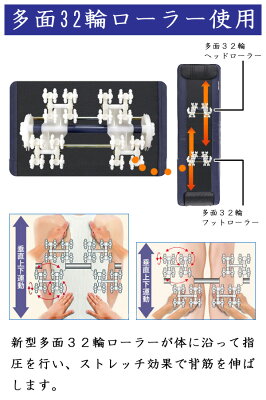 ■疲労回復 ■血行をよくする ■神経痛・筋肉痛の痛みに緩解 ■筋肉の疲れをとる ■筋肉のコリをとる 新型多面32輪ローラーが身体を沿って指圧を行い、ストレッチ効果で背筋を伸ばします。