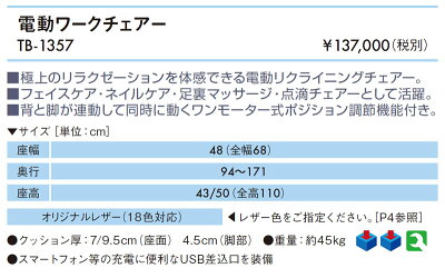 TB-1324 電動ワークチェアー 極上のリラクゼーションを体感できる電動リクライニングチェアー。