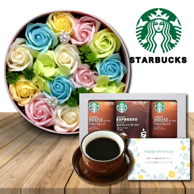 花とコーヒーのセットローズガーデンアレンジとスターバックスコーヒギフトセット 送料無料 北海道・九州・沖縄お届け不可生花 花束 メッセージカード生花 花 プレゼント 贈り物誕生日 記念日 お祝い 送別 FKAA