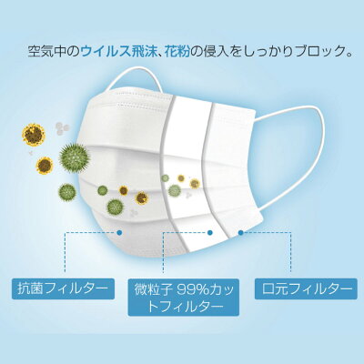 国産高機能カットフィルター一般財団法人カケンテストセンター試験済み・バクテリア(細菌)濾過効率3.0μm [BFE]99% 花粉や飛沫など比較的大き目の粒子を99%カット!・微粒子濾過効率0.1μm [PFE]99% インフルエンザウィルスなど0.1μmの粒子を99%カット!※日本のサージカルマスクの基準に合わせた高品質マスクです。